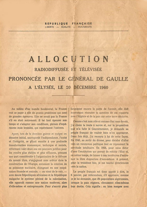 Par cette allocution, prononcée depuis le palais de l'Elysée, le général de Gaulle parle à nouveau du référendum qu'il a annoncé le 16 novembre 1960, et qui doit avoir lieu le 8 janvier 1961. La consultation porte sur un projet de loi, simple prétexte, techniquement indispensable pour obéir aux conditions de l'article 11 de la Constitution, alors que la véritable question est celle de l'autodétermination des populations d'Algérie. Le général exhorte à voter "oui" ; il s'agit pour lui d'obtenir le soutien explicite de l'opinion publique. La solution qu'il appelle alors de ses voeux pour l'Algérie est celle d'une "Algérie algérienne' où les deux communautés, musulmans et Européens d'origine, cohabiteraient, et où la France continuerait à être associée au pays. Après avoir salué l'action de l'armée en Algérie, le Général renouvelle son appel aux rebelles à cesser les combats.