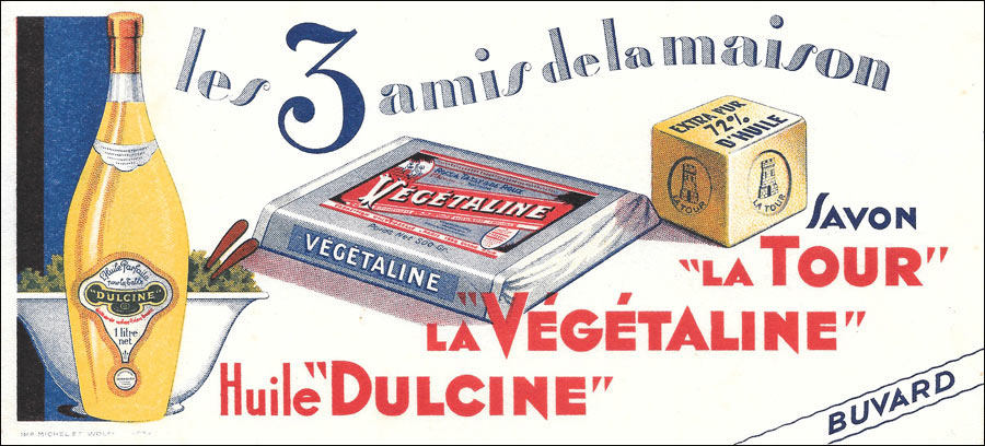 "Végétaline" - Huile "Dulcine" - Savon "La Tour", produits par les Etablissements Rocca, Tassy et De Roux à Marseille.