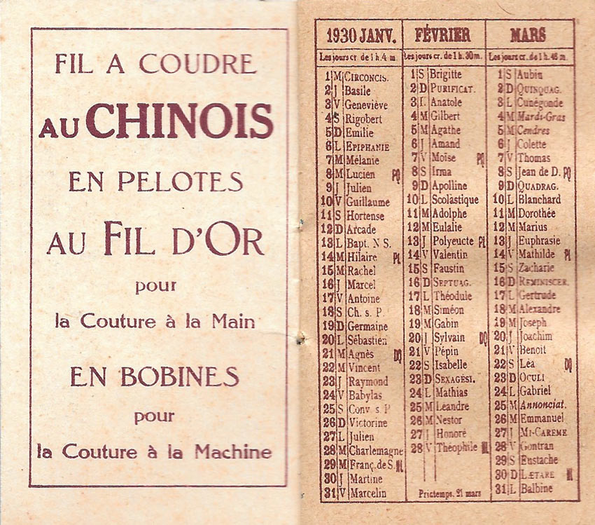 Calendrier 1930 Fil au Chinois