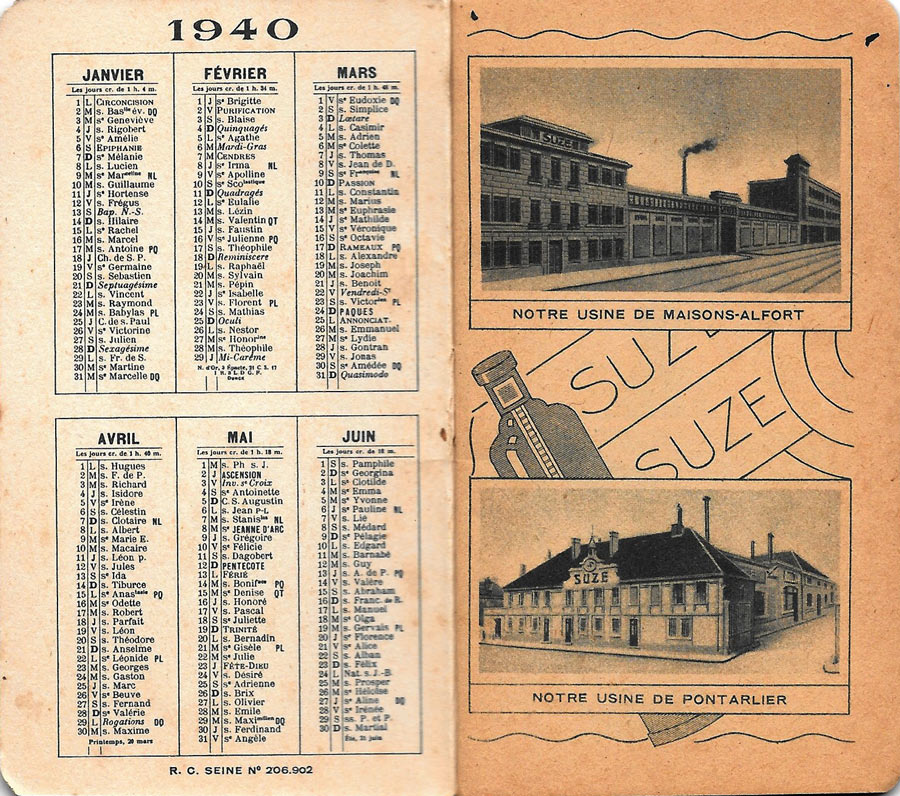 Calendrier 1940 Suze