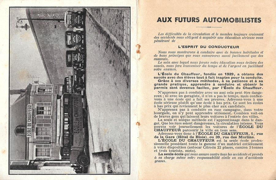 L'Ecole du Chauffeur fondée en 1929, implantée à Orléans, au 39 de la rue des Murlins, à l’angle de la rue Caban, l’école du chauffeur enseignait la conduite afin d’obtenir tous les types de permis de conduire: auto, moto, poids lourd. En 1939, une publicité parue dans le journal du Loiret vantait "la plus ancienne école de conduite de la région renommée par ses scrupules et ses succès", et proposait des cours avec "une voiture normale" (un seul volant) et "un matériel souple et en très bon état". Cette école était une agence de l’auto-école installée au 1 rue de la Gare.