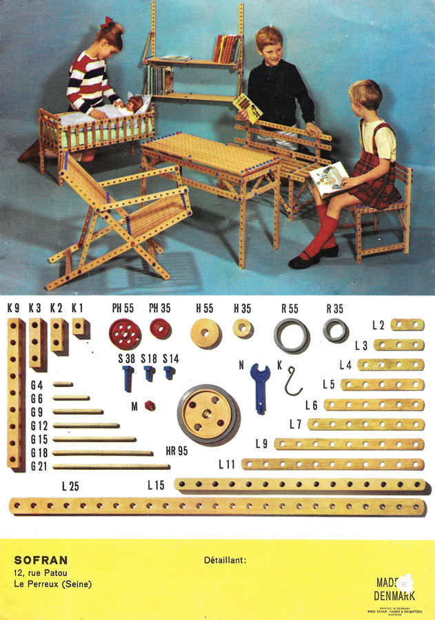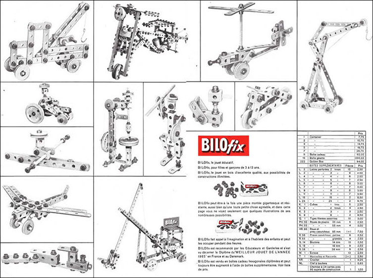 Les brevets danois montrent que LEGO a enregistré le nom BILOfix en 1959. L'idée était que ces jouets éducatifs en bois mettraient au défi les petits et les grands enfants. Les jouets se composaient de quelques petits cadres perforés de différentes longueurs. Les listes ont été complétées combinées avec des vis et des écrous en plastique.
