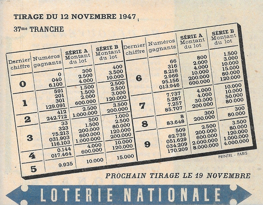 Feuillet publicitaire de la Loterie Nationale daté Novembre 1947.