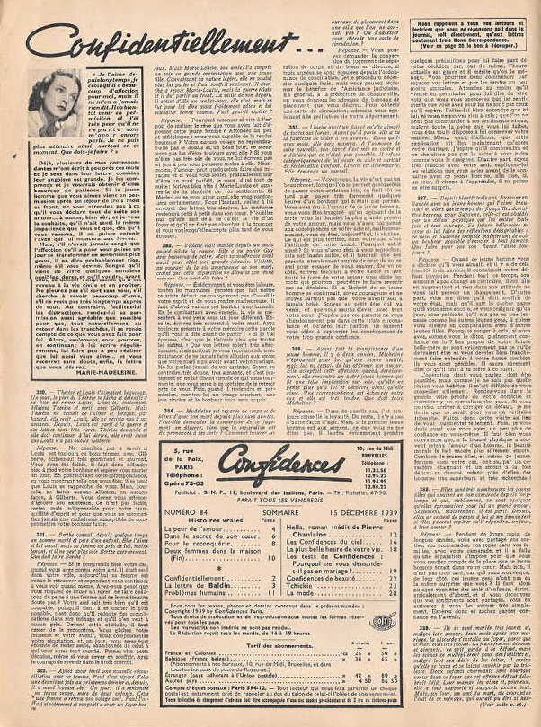 Confidences - N°84 du 15 Décémbre 1939 - 1 Fr - Histoires vraies - 28 pages