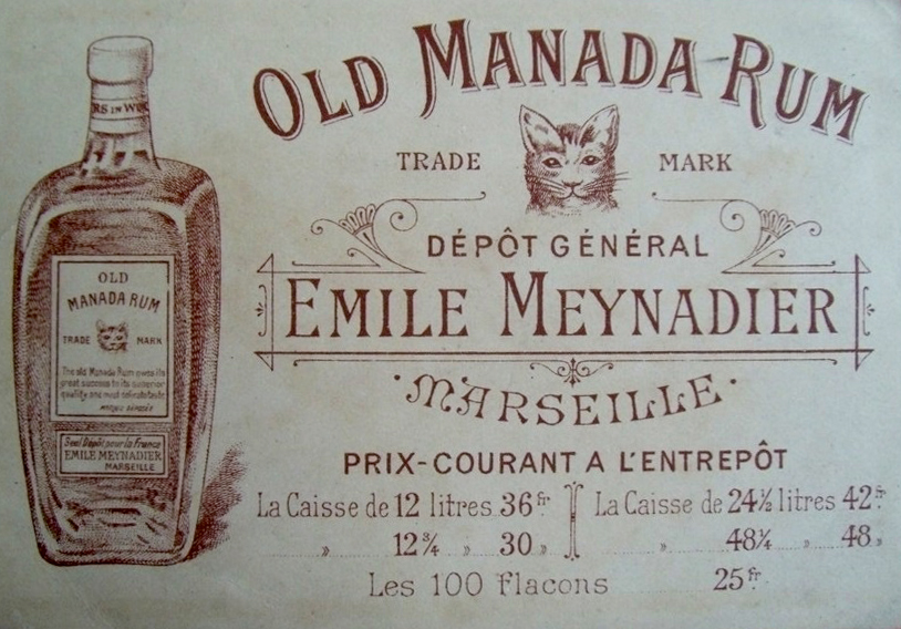 Dépôt Général Emile Meynadier, dont la maison avait été fondée vers 1895, se présentait fièrement comme le seul importateur en France de l’« Old Manada Rum »