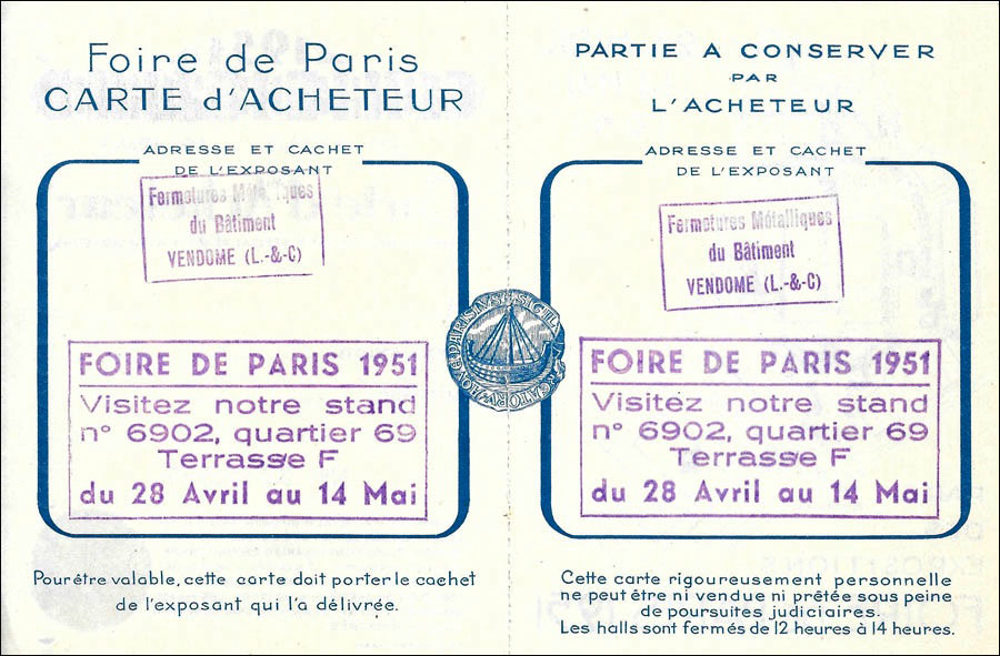 Carte d'acheteur Foire de Paris 1951 délivré par exposant, donnant droit au tarif spécial réservé aux acheteurs
