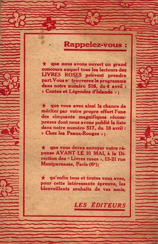 Editée par Larousse, la collection "Les Livres Roses pour la Jeunesse" compte 719 numéros parus entre 1909 et 1939 sous forme de fascicules à couverture illustrée et illustrations dans le texte.