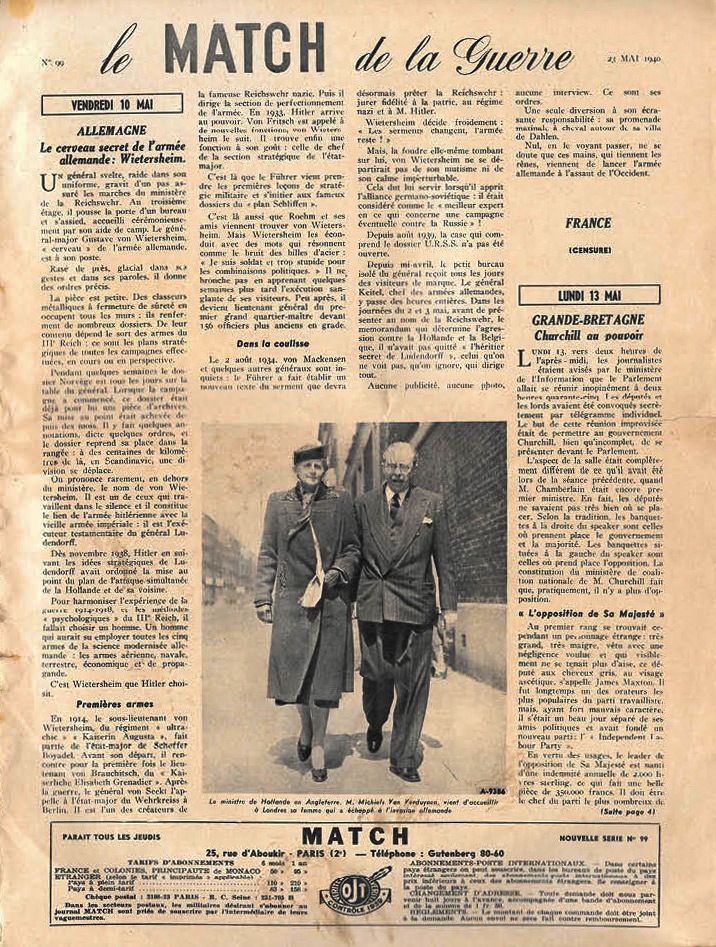 Match N° 99 - 23 mai 1940 - la bataille - les parachutistes sont des soldats ou des espions - ils étaient les voisins pacifiques de Hitler - la défense contre les avions - l'armée française du levant dans le bassin oriental carrefour des empires.